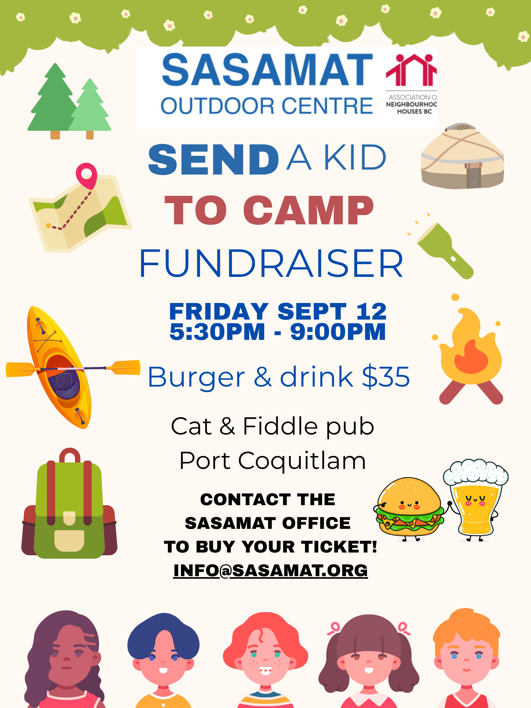 We are excited to announce that we are hosting a fundraiser on September 12 at the Cat and Fiddle Pub in Port Coquitlam! Your ticket includes a burger and drink, with all proceeds going to our Send a Kid to Camp fund. Send a Kid to Camp offers financial assistance with camp fees to families who face financial barriers. The fundraiser is open to ALL AGES- bring your whole family!